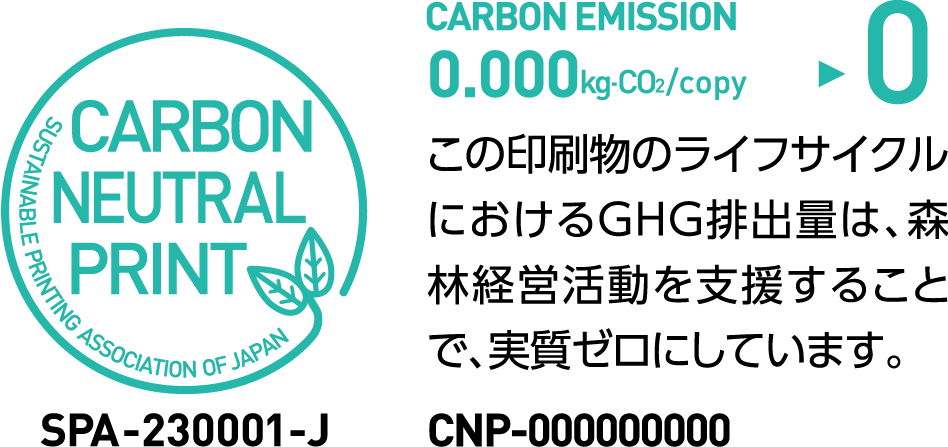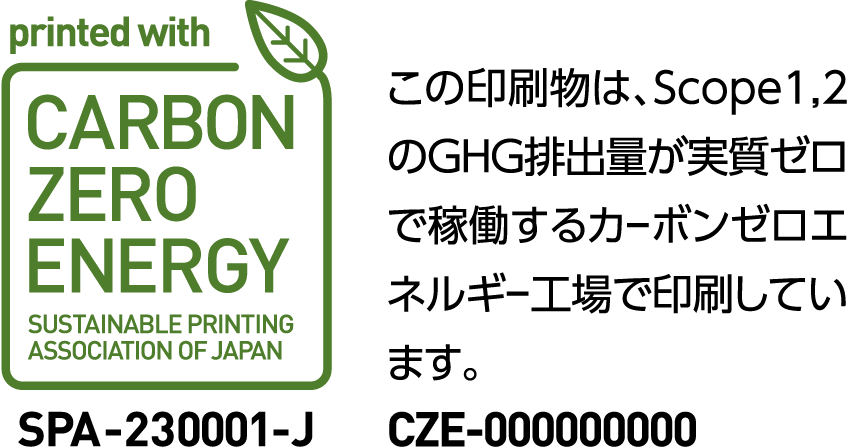 光陽社グループは全体で、太陽光パネルによる自家発電、再エネ電力、非化石証書、省エネクレジットにて、Scope1,2のGHG排出量を、実質ゼロにしています。カーボンゼロで稼働する弊社工場で印刷した製品は、カーボンゼロエネルギーマークを表示して ご提供可能です。 さらに、エネルギー以外で発生する全GHGを、森林経営を支援することでカーボンオフセットした製品には、カーボンニュートラルプリントマークを表示することが可能です。