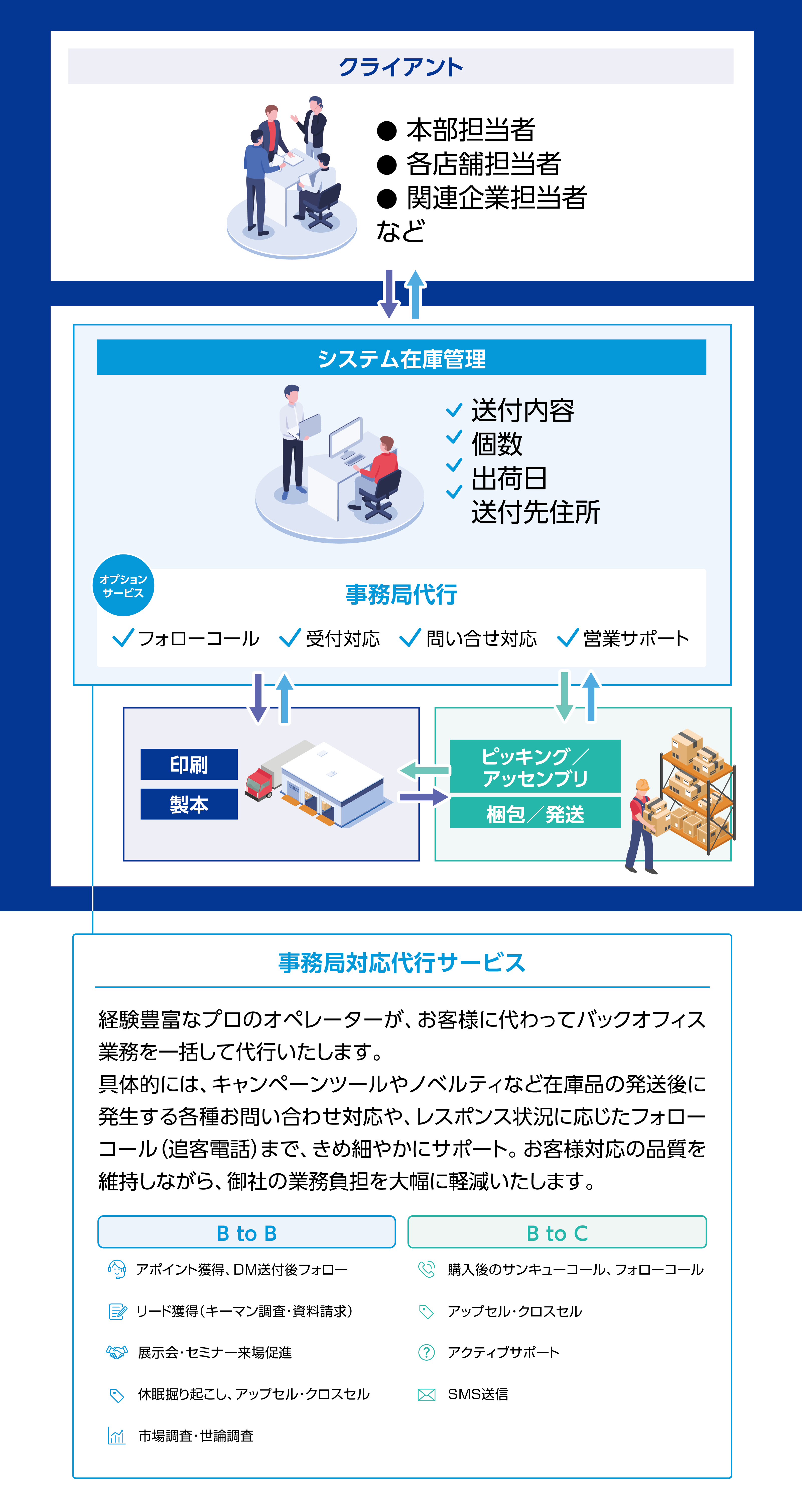 印刷物の制作から、商品の在庫保管・同梱・発送までをワンストップで対応しています。分散しがちな印刷・在庫管理・梱包・発送の工程を一括でお任せいただくことで、社内業務の効率化とスピーディな販促展開を実現。DMやキャンペーン発送、展示会後のフォローアップツールとしても、効果的にご活用いただけます。