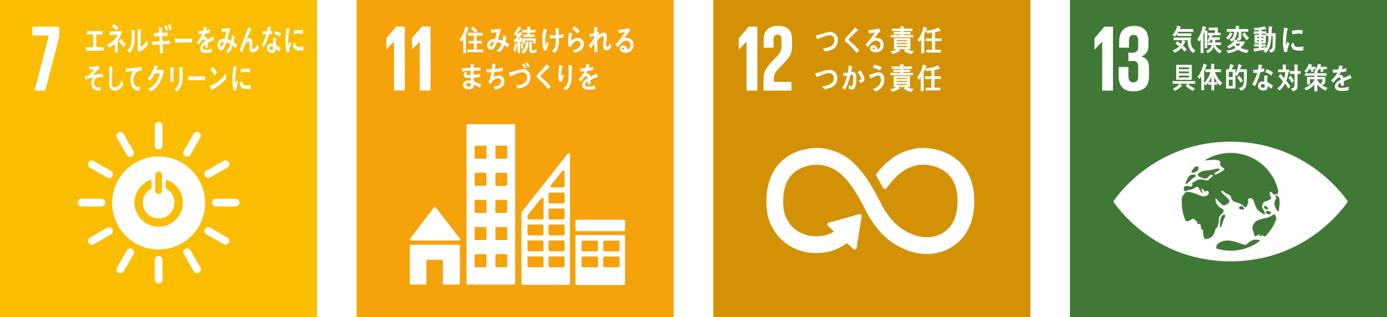 SDGsへの貢献をアピール 持続可能な世界を実現するための17ゴールから構成される SDGs目標のうち、7・11・12・13の項目に貢献します。 GHG削減を支援し埋め合わせ GHGを削減する活動を支援し相殺します。
