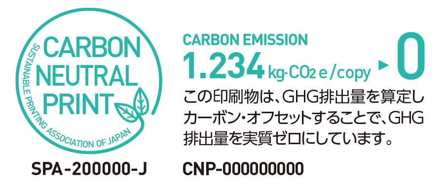 印刷物のライフサイクルにおけるGHG排出量(製品カーボンフットプリント:CFP:Carbon Footprint of Products)を算定し、有償でカーボンニュートラル化します。印刷物には「カーボンニュートラルプリント」マークを表示でき、脱炭素への貢献をアピールできます。カーボン・オフセットを行った証書も発行いたします。
