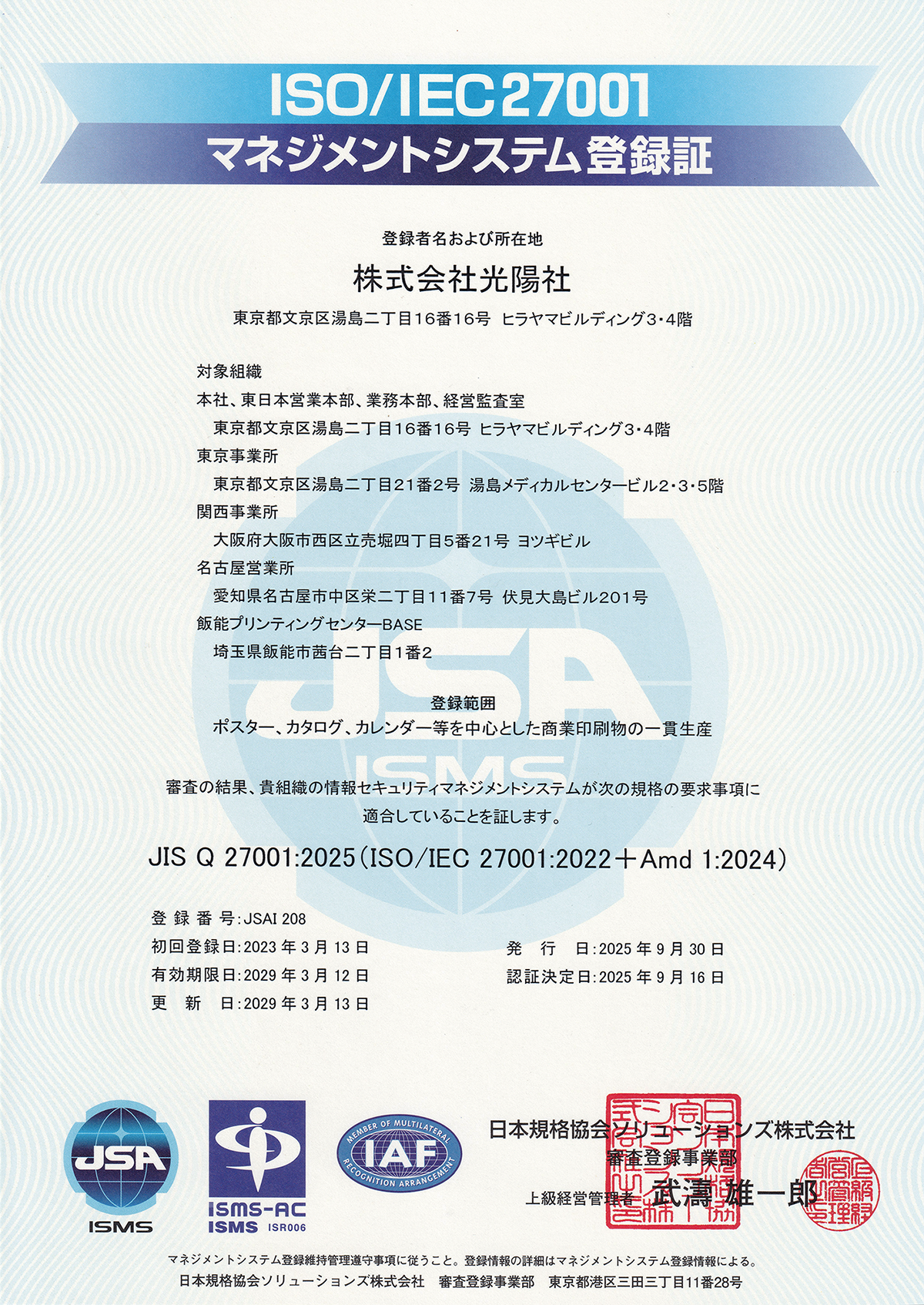 当社は、商業印刷物を中心とした広告宣伝物の生産を行っており、様々な製品情報や大量の個人情報を取り扱っています。これらの重要な情報資産をしっかりと管理し保護することは、当社としての社会的責務であると認識しています。当社はここに情報セキュリティ方針を定め、この方針に従いISMSの適切な運用に努めることで、お客様をはじめとした全てのステークホルダーの皆様に信頼と安心を提供してまいります。